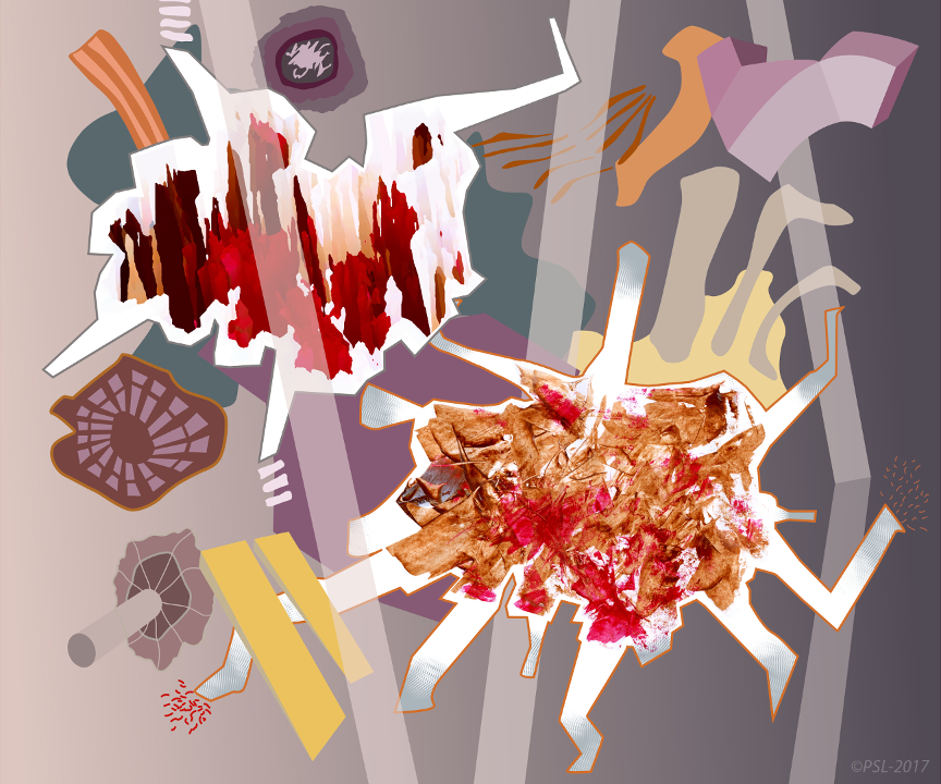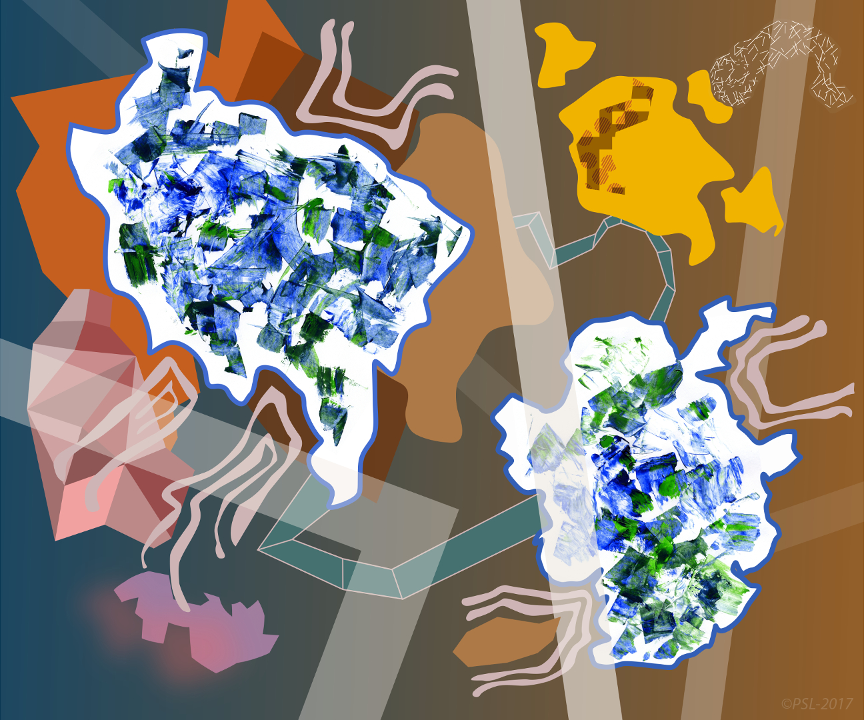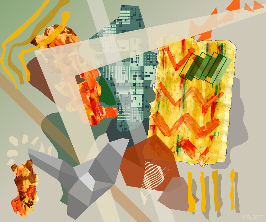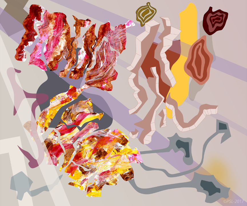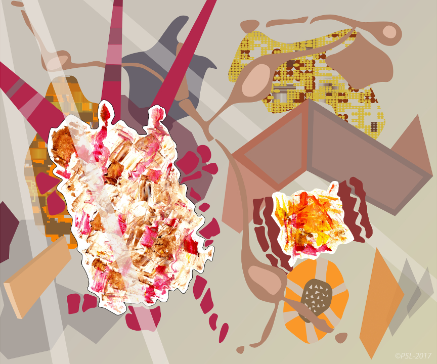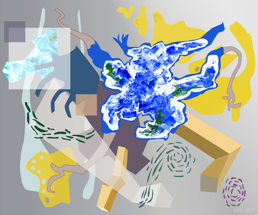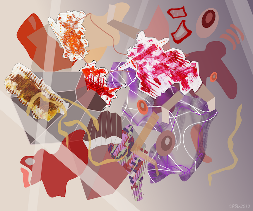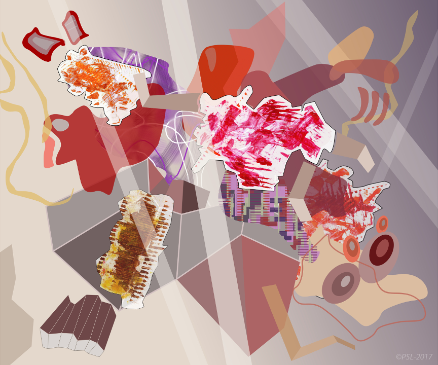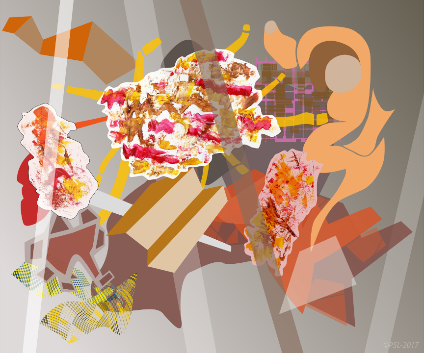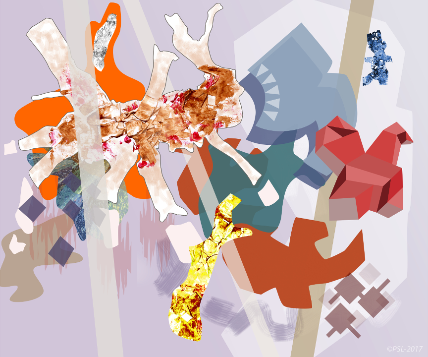 Les créations mêlent et confrontent donc une matière picturale étalées à l’aide de spatules, que l’on pourrait qualifier de peinture concrète, et une peinture digitale obtenue grâce à des outils numériques (palette et logiciels graphiques).